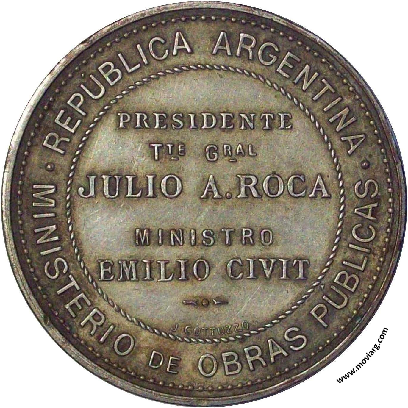 Anverso: AGUAS CORRIENTES - JUJUY - 20 SETIEMBRE 1904 Reverso: REPUBLICA ARGENTINA / MINISTERIO DE OBRAS PUBLICAS / PRESIDENTE / TTE GRAL / JULIO A. ROCA / MINISTRO / EMILIO CIVIT. Firma: J. GOTTUZZO Referencia: | |
