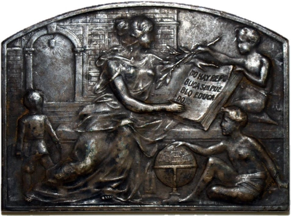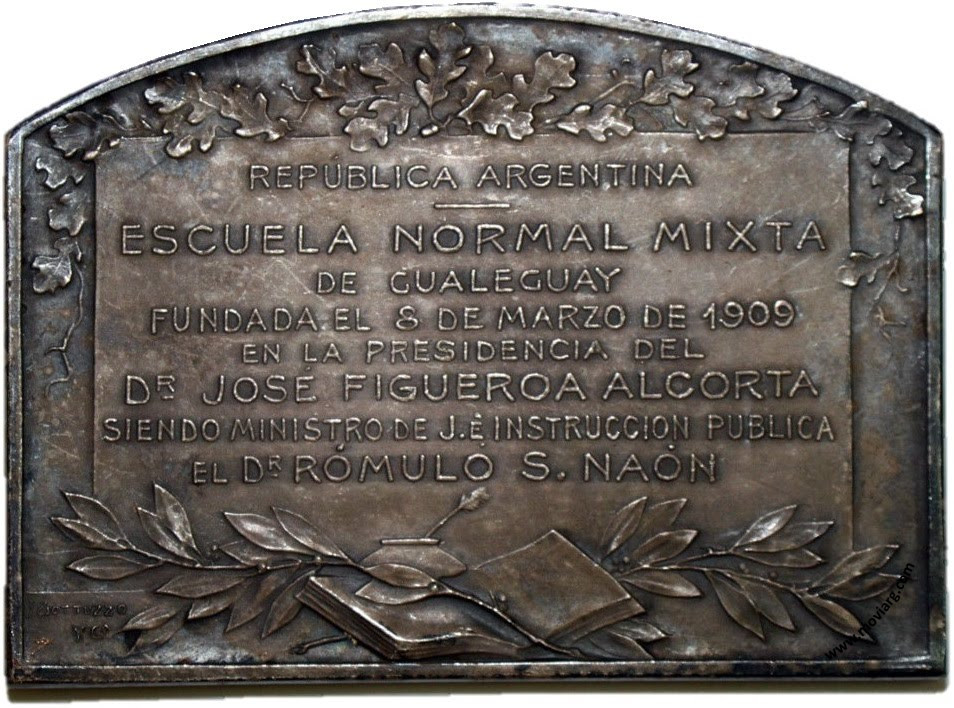Anverso: Campo: NO HAY REPU / BLICA SIN PUE / BLO EDUCA / DO. Reverso: REPÚBLICA ARGENTINA / ESCUELA NORMAL MIXTA / DE GUALEGUAY / FUNDADA EL 8 DE MARZO DE 1909 / EN LA PRESIDENCIA DEL / DR. JOSÉ FIGUEROA ALCORTA / SIENDO MINISTRO DE J. É INSTRUCCION PUBLICA / EL DR. RÓMULO S. NAÓN. Firma: GOTTUZZO / Y CA. Referencia: | |