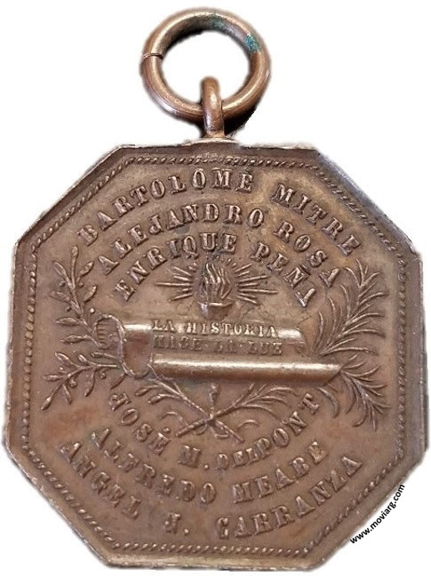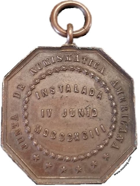 Anverso: BARTOLOMÉ MITRE / ALEJANDRO ROSA / ENRIQUE PEÑA / JOSÉ M. DEL PONT / ALFREDO MEABE / ANGEL M. CARRANZA. Campo: LA HISTORIA / HACE LA LUZ Reverso: JUNTA DE NUMISMÁTICA AMERICANA / INSTALADA / IV JUNIO / MDCCCXCIII Referencia: | |