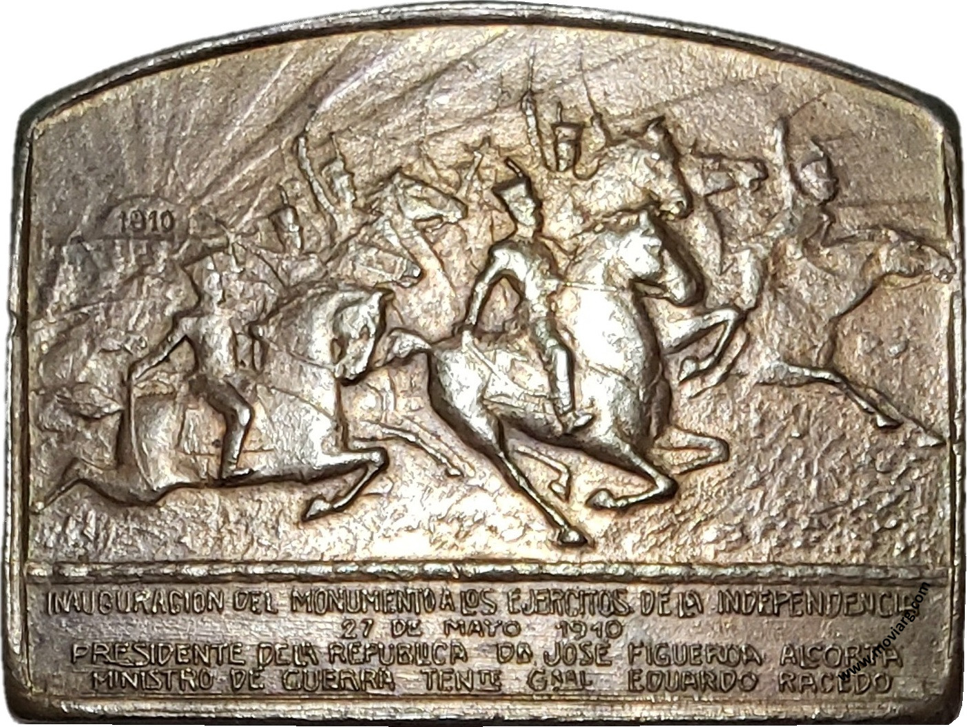 Anverso: Reverso: INAUGURACION DEL MONUMENTO A LOS EJERCITOS DE LA INDEPENDENCIA / 27 DE MAYO 1910 / PRESIDENTE DE LA REPUBLICA DR. JOSÉ FIGUEROA ALCORTA / MINISTRO DE GUERRA TENTE. GRAL. EDUARDO RACEDO. Campo: 1810 Referencia: | |