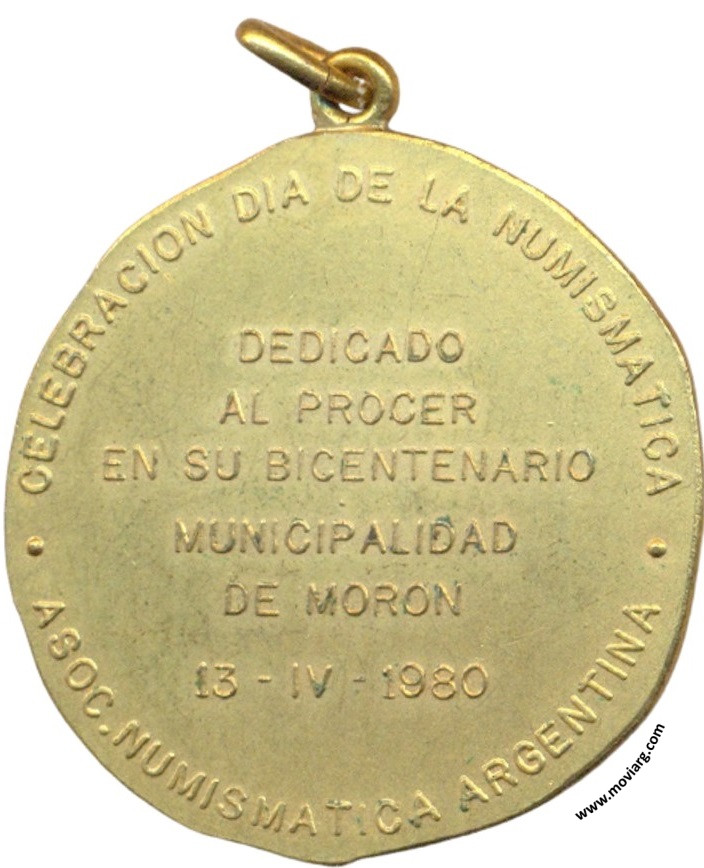 Anverso: BERNARDINO RIVADAVIA / 1780 - 1845. Firma: GOTTUZZO Y CA. Reverso: CELEBRACION DIA DE LA NUMISMATICA / ASOC. NUMISMATICA ARGENTINA / DEDICADO / AL PROCER / EN SU BICENTENARIO / MUNICIPALIDAD / DE MORON / 13 - IV - 1980 Referencia: | |