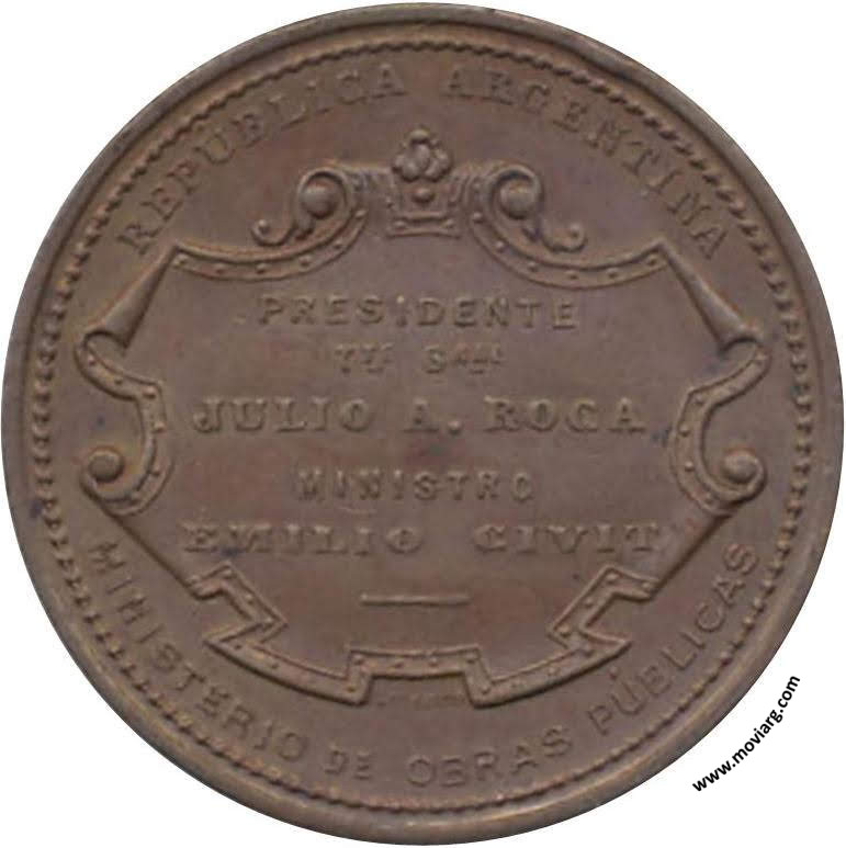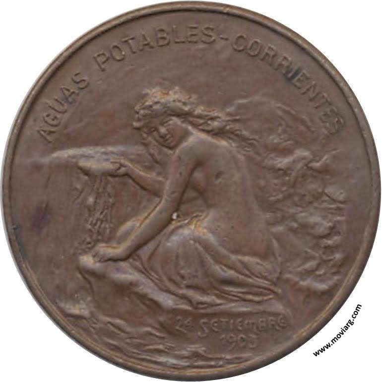 Anverso: AGUAS POTABLES - CORRIENTES / 14 SETIEMBRE / 1903 Reverso: REPUBLICA ARGENTINA / PRESIDENTE / TTE. GRAL. / JULIO A. ROCA / MINISTRO / EMILIO CIVIT / MINISTERIO DE OBRAS PÚBLICAS. Firma: GOTTUZZO Referencia: | |