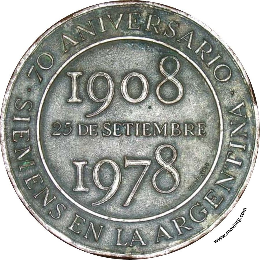 Anverso: WERNER VON SIEMENS / 1816 / 1892 Reverso: 70 ANIVERSARIO / SIEMENS EN LA ARGENTINA / 1908 / 25 DE SETIEMBRE / 1978. Firma: NOTARI Referencia: | |