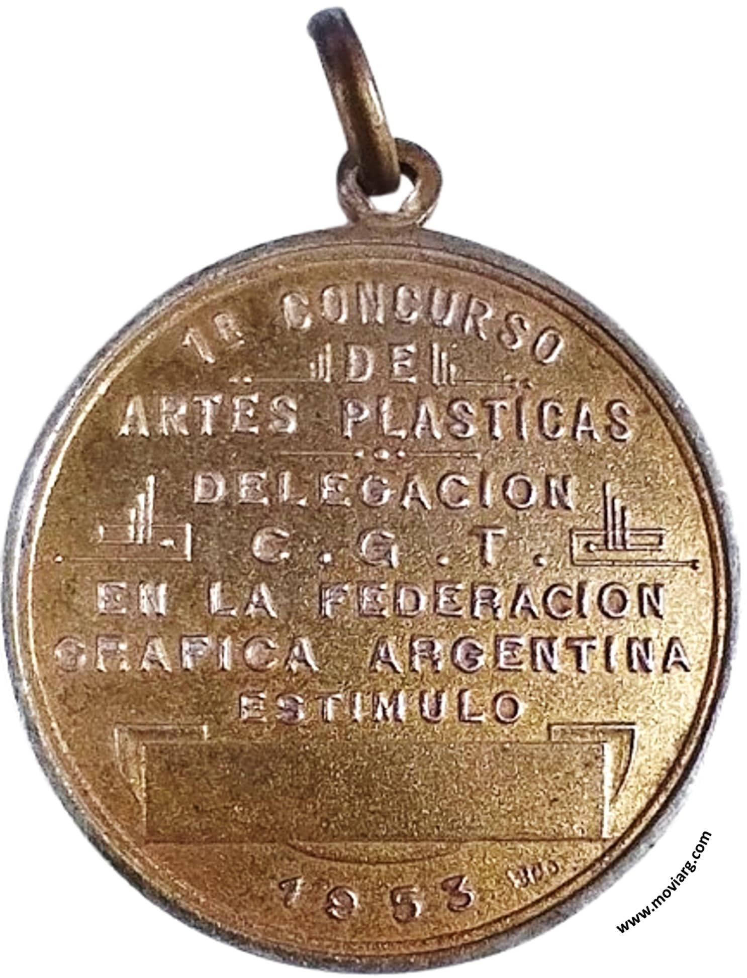 Anverso: Reverso: 1R. CONCURSO / DE / ARTES PLASTICAS / DELEGACION / C.G.T. / EN LA FEDERACION / GRAFICA ARGENTINA / ESTIMULO / 1953. Exergo: [ 900 ] Referencia: | |