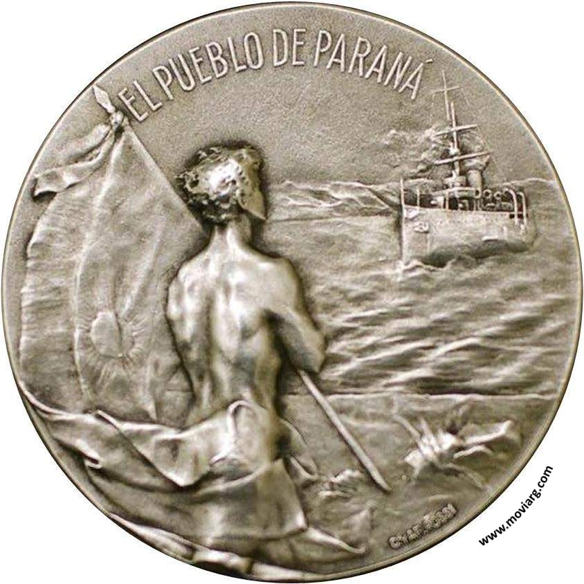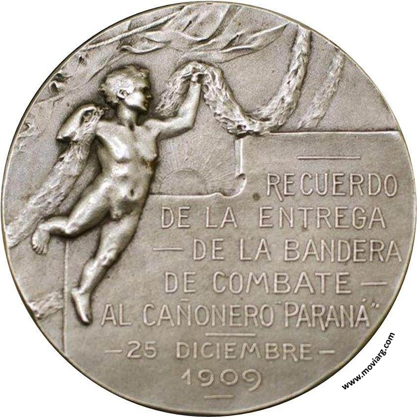 Anverso: EL PUEBLO DE PARANÁ. Firma: C. Y AF. ROSSI Reverso: RECUERDO / DE LA ENTREGA / DE LA BANDERA / DE COMBATE / AL CAÑONERO "PARANÁ" / 25 DICIEMBRE / 1909 Referencia: | |