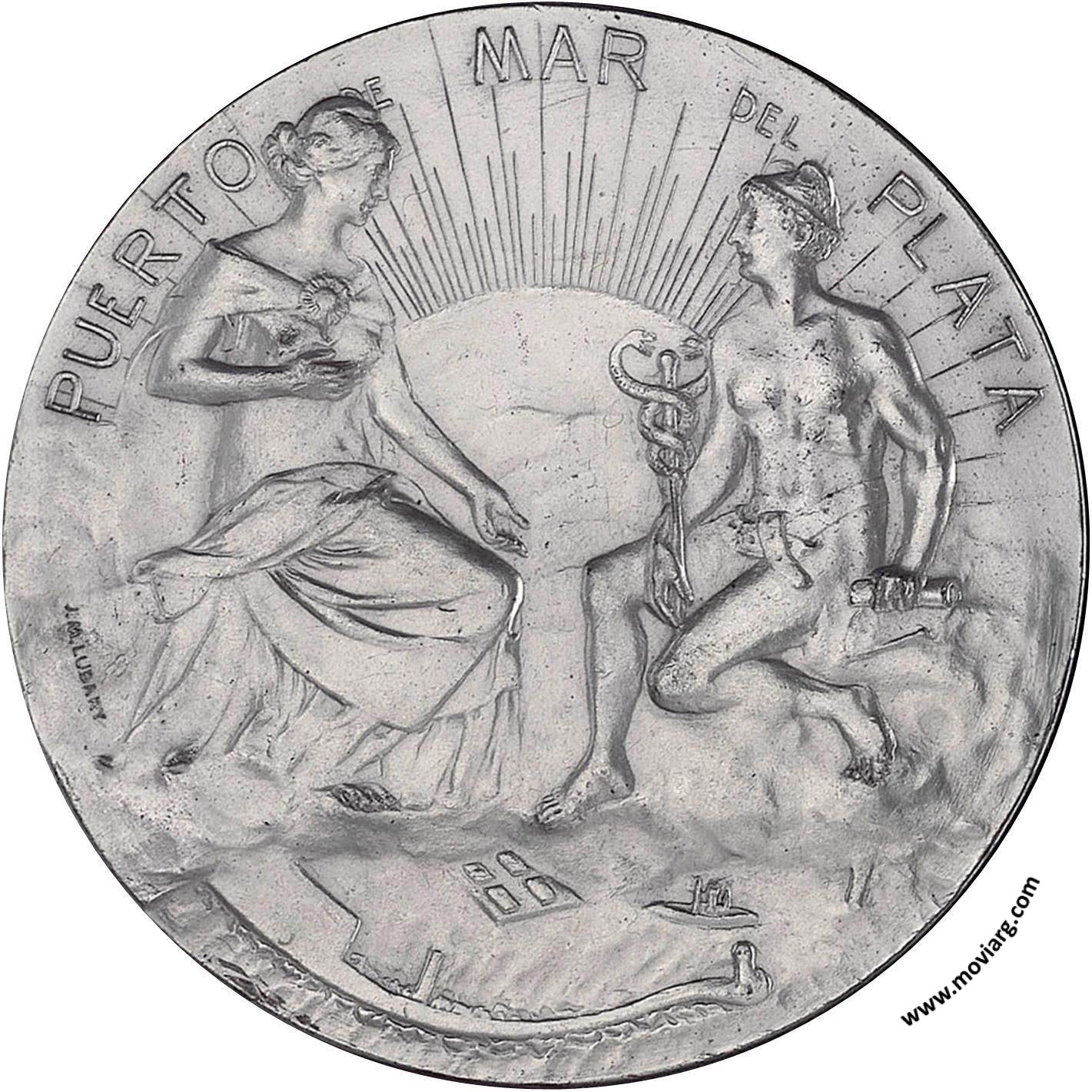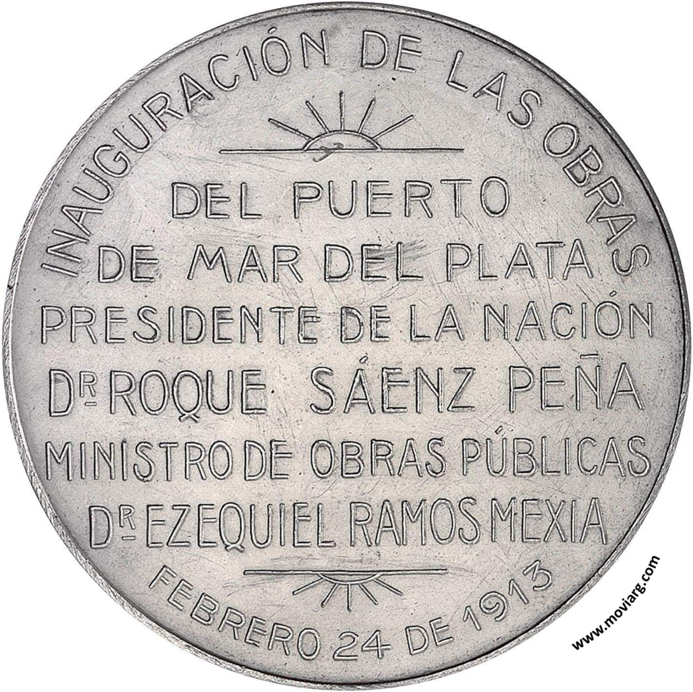 Anverso: PUERTO DE MAR DEL PLATA. Firma: J. M. LUBARY Reverso: INAUGURACION DE LAS OBRAS / DEL PUERTO / DE MAR DEL PLATA / PRESIDENTE DE LA NACION / DR. ROQUE SAENZ PEÑA / MINISTRO DE OBRAS PUBLICAS / DR. EZEQUIEL RAMOS MEXIA / FEBRERO 24 DE 1913 Referencia: | |