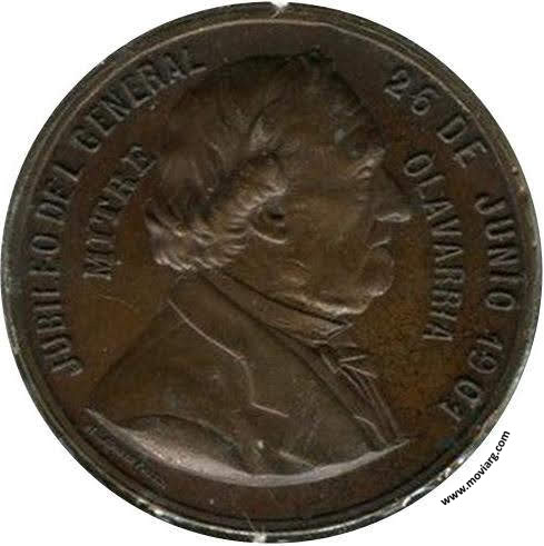 Anverso: JUBILEO DEL GENERAL / MITRE. 26 DE JUNIO 1901 / OLAVARRIA. Firma: BELLAGAMBA Y ROSSI Reverso: HOMENAJE / AL / GRAN PATRICIO / AMERICANO / EN SU / 80° ANIVERSARIO. Referencia: ROSA-15 (M80) | |