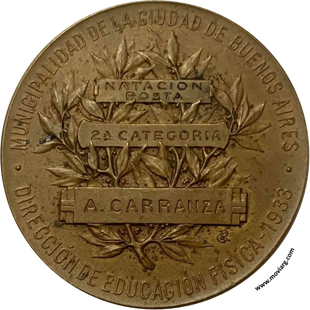 Anverso: CAMPEONATOS / MUNICIPALES. Firma: CONSTANTE ROSSI Reverso: MUNICIPALIDAD DE LA CIUDAD DE BUENOS AIRES / DIRECCIÓN DE EDUCACIÓN FÍSICA - 1933 / [ NATACION ] / [ POSTA ] / [ 2A. CATEGORIA ] / [ A. CARRANZA ] Referencia: | |