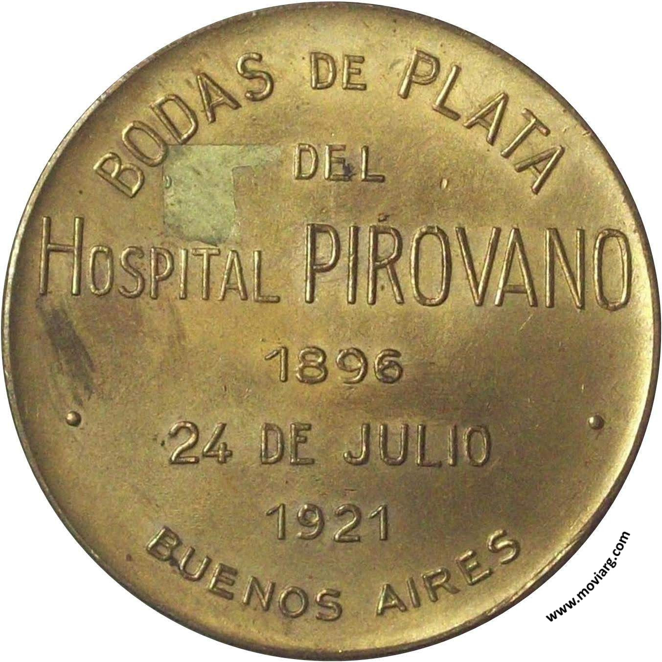 Anverso: IGNACIO PIROVANO / 1844 / 1895. Firma: CONSTANTE ROSSI Reverso: BODAS DE PLATA / DEL / HOSPITAL PIROVANO / 1896 / 24 DE JULIO / 1921 / BUENOS AIRES Referencia: | |