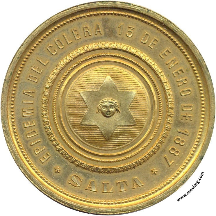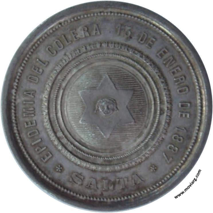 Anverso: EPIDEMIA DEL COLERA 13 DE ENERO DE 1887 / SALTA Reverso: EL / PUEBLO / AGRADECIDO / Á SUS / SERVIDORES. Firma: PODESTÁ & H. Referencia: | |
