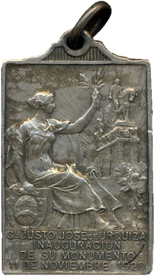 Anverso: GL. JUSTO JOSÉ DE URQUIZA / INAUGURACIÓN / DE SU MONUMENTO / 11 DE NOVIEMBRE 1920 Reverso: LA PROVINCIA / DE ENTRE RIOS / AL ORGANIZADOR DE LA / UNIDAD NACIONAL / Y PRIMER PRESIDENTE / CONSTITUCIONAL / DE LA REPÚBLICA / 1853 - 1920. Firma: CONSTANTE ROSSI Referencia: | |