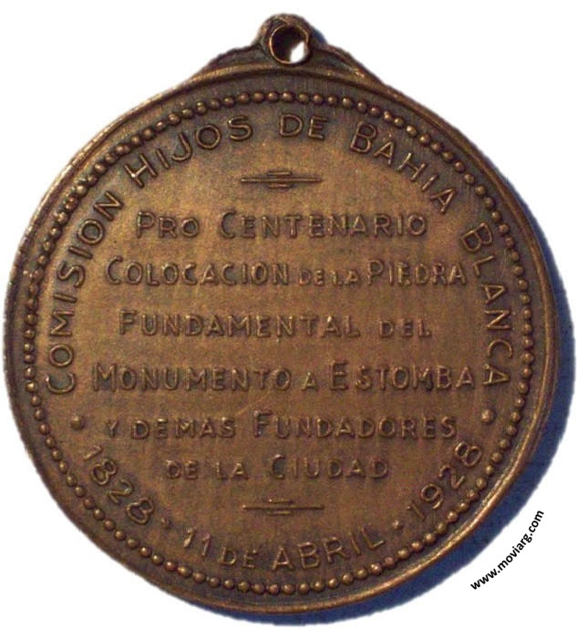 Anverso: Firma: OLIVIA NAVARRO Reverso: COMISION HIJOS DE BAHIA BLANCA / 1828 · 11 DE ABRIL · 1928 / PRO CENTENARIO / COLOCACION DE LA PIEDRA / FUNDAMENTAL DEL / MONUMENTO A ESTOMBA / Y DEMAS FUNDADORES / DE LA CIUDAD Referencia: | |