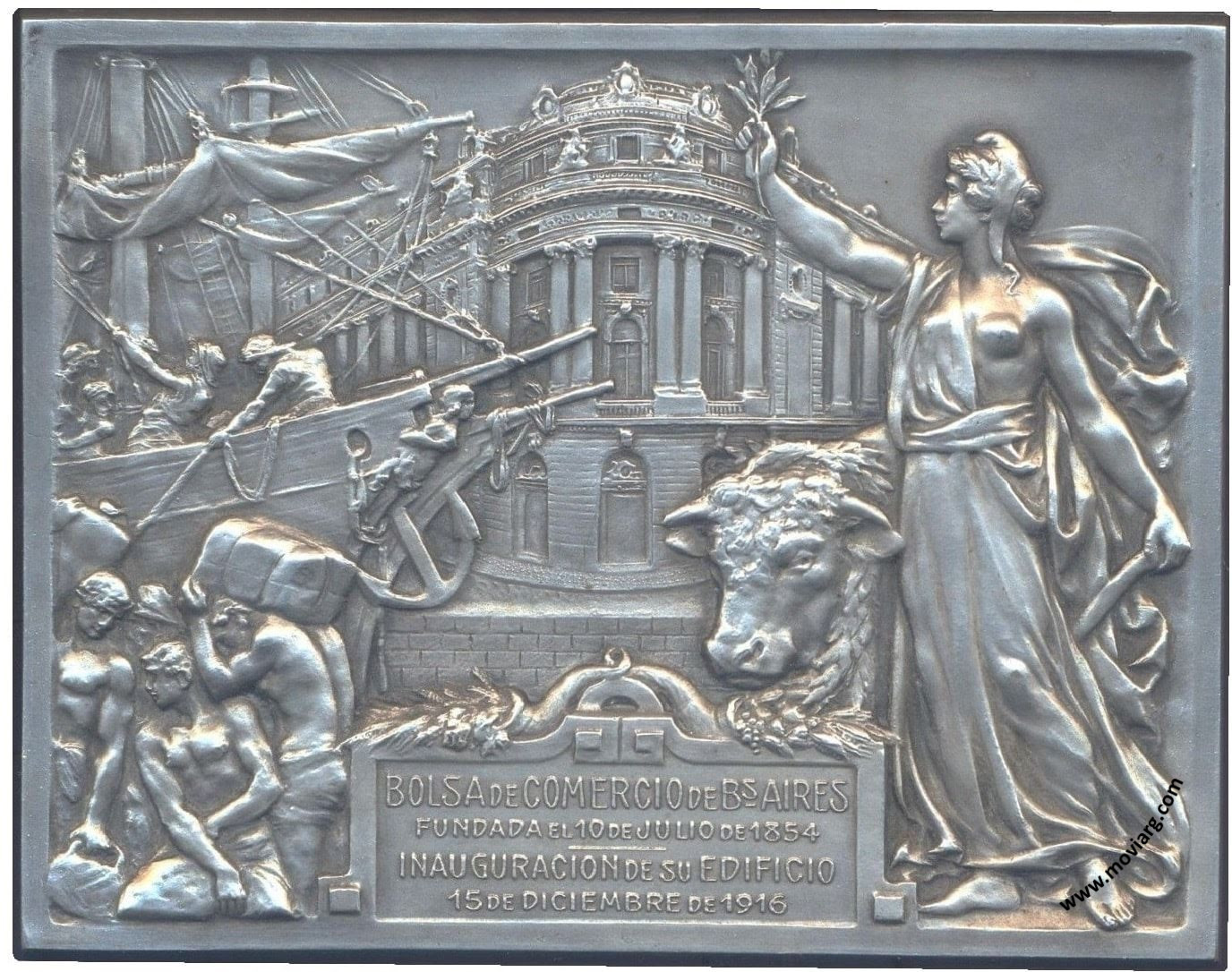 Anverso: BOLSA DE COMERCIO DE BS. AIRES / FUNDADA EL 10 DE JULIO DE 1854 / INAUGURACION DE SU EDIFICIO / 15 DE DICIEMBRE DE 1916 Reverso: CÁMARA DE LA BOLSA DE COMERCIO DE BS. AS. / PRESIDENTE : LUIS E. ZUBERBÜHLER / VICE PRESIDENTE : JUAN CHAPAR / TESORERO : MARTIN S. ETCHART / SECRETARIO : ARTURO LÓPEZ ALFARO / VOCALES / IRENEO CUCULLU, ANSELMO VILLAR, SANTIAGO CAPDEPONT, JOSÉ MARIA BIDAU, CARLOS F. VIDELA, / MARIANO J. MARTINEZ, JOSÉ F. MACADAM, CAYETANO SANCHEZ, / VICTORIANO VILLAMIL, PEDRO BERCETCHE, JORGE C. DICKINSON, / NICOLÁS MARTELLI, MIGUEL MIHANOVICH, JUAN WRIGHT, / ANTONINO BENITEZ Y MARTIN PICO. / SÍNDICO : GREGORIO F. RODRIGUEZ / DIRECTORIO DE LA SOCIEDAD CONSTRUCTORA / DE LA BOLSA DE COMERCIO / PRESIDENTE : PEDRO BERCETCHE / VICE PRESIDENTE : LUIS P. MIGNAQUY / SECRETARIO : LUIS BARBERINI / VOCAL : BENIGNO PEÑA / " EMILIO MIHURA / SÍNDICO : HORACIO RANDLE. Firma: J. GOTTUZZO Y CA. Referencia: | |