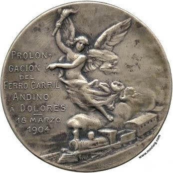 Anverso: PROLON- / GACION / DEL / FERRO CARRIL / ANDINO / Á DOLORES / 18 MARZO / 1904 Reverso: REPÚBLICA ARGENTINA / MINISTERIO DE O. PÚBLICAS / PRESIDENTE / JULIO A. ROCA / MINISTRO / EMILIO CIVIT. Firma: J. GOTTUZZO Referencia: | |