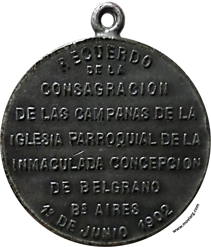 Anverso: Firma: BELLAGAMBA Y ROSSI Reverso: RECUERDO / DE LA / CONSAGRACION / DE LAS CAMPANAS DE LA / IGLESIA PARROQUIAL DE LA / INMACULADA CONCEPCION / DE BELGRANO / BS. AIRES / 1° DE JUNIO 1902 Referencia: | |