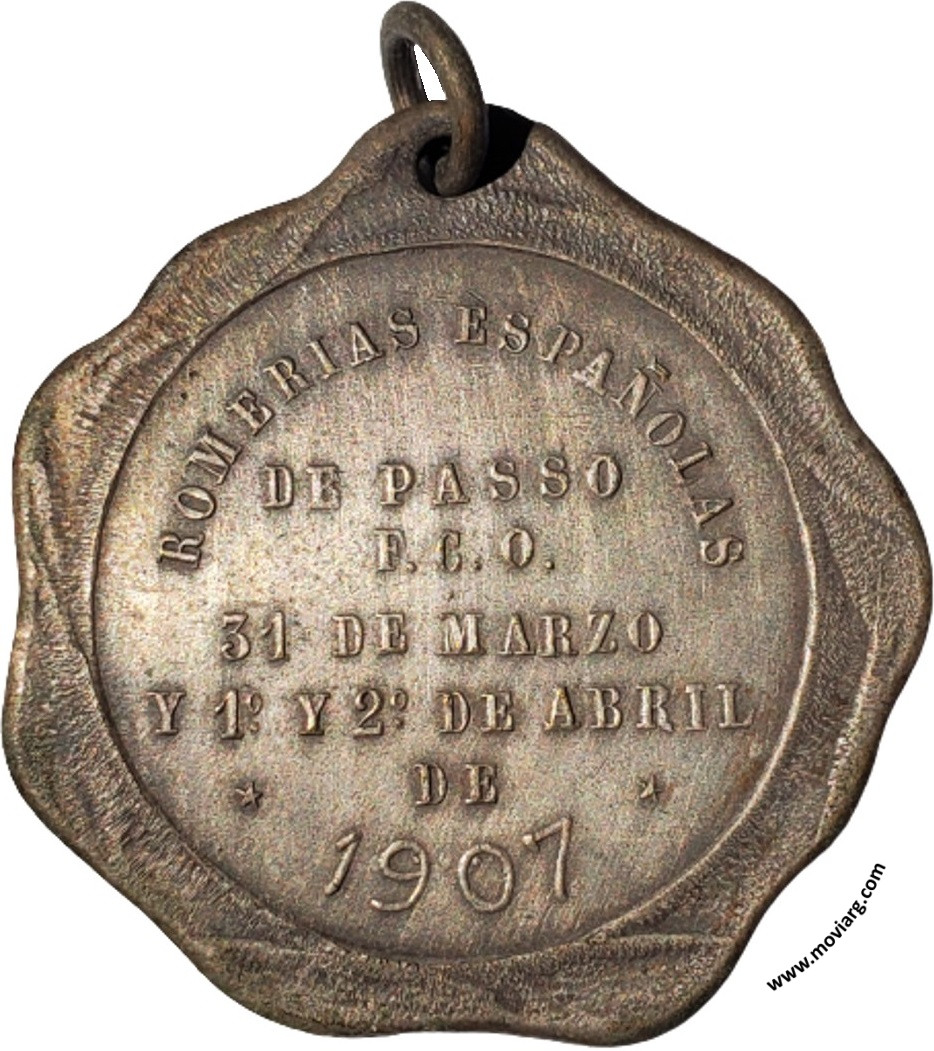 | Año: 1907 Romerías Metal: Plateado - Peso: 10.87gr - Módulo: 31.42x32.10mm - Espesor: 1.76mm - Rotación: 12hrs Grabador: Horta y Cia | |