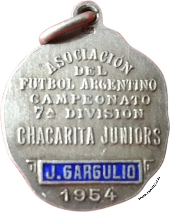 Anverso: Campo: AFA Reverso: ASOCIACION / DEL / FUTBOL ARGENTINO / CAMPEONATO / 7A. DIVISION / CHACARITA JUNIORS / [ J. GARGULIO ] / 1954. Exergo: [ 900 ] Referencia: | |