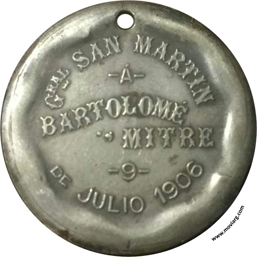Anverso: BARTOLOMÉ MITRE. Firma: BELLAGAMBA Y ROSSI (???) Reverso: GRAL. SAN MARTIN / Á / BARTOLOMÉ / MITRE / 9 / DE JULIO 1906 Referencia: | |