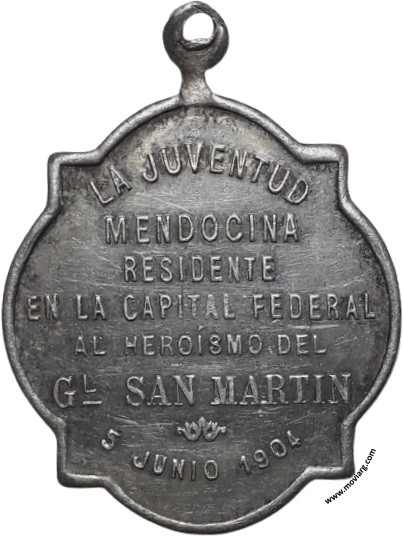 Anverso: Firma: BELLAGAMBA Y ROSSI Reverso: LA JUVENTUD / MENDOCINA / RESIDENTE / EN LA CAPITAL FEDERAL / AL HEROÍSMO DEL / GL. SAN MARTIN / 5 JUNIO 1904 Referencia: | |