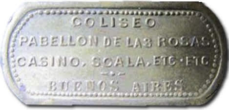 Anverso: 10 / CENTAVOS Reverso: COLISEO / PABELLON DE LAS ROSAS / CASINO, SCALA, ETC. ETC. / BUENOS AIRES Referencia: | |