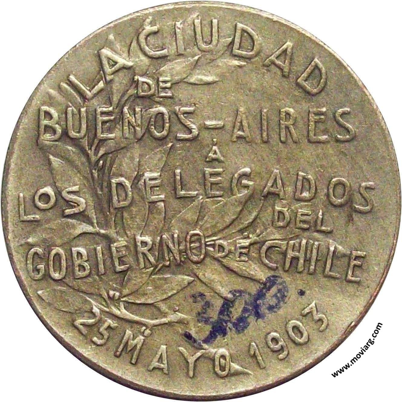 Anverso: AVSPICIVM · MELIORIS · AEVI. Firma: CASANOVAS Y HORTA Reverso: LA CUIDAD / DE / BUENOS - AIRES / Á / LOS DELEGADOS / DEL / GOBIERNO DE CHILE / 25 MAYO 1903 Referencia: | |
