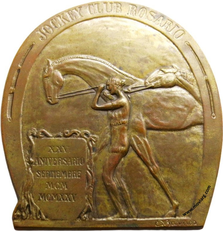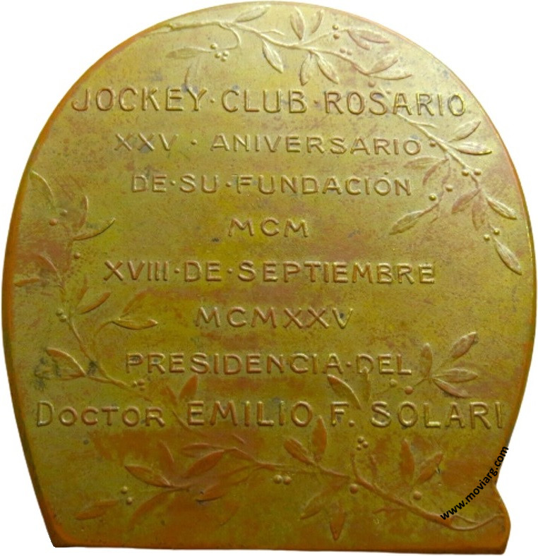 Anverso: JOCKEY CLUB ROSARIO / XXV / ANIVERSARIO / SEPTIEMBRE / MCM / MCMXXV. Firma: E. BARNES Reverso: JOCKEY CLUB ROSARIO / XXV ANIVERSARIO / DE SU FUNDACIÓN / MCM / XVIII DE SEPTIEMBRE / MCMXXV / PRESENCIA DEL / DOCTOR EMILIO F. SOLARI Referencia: | |