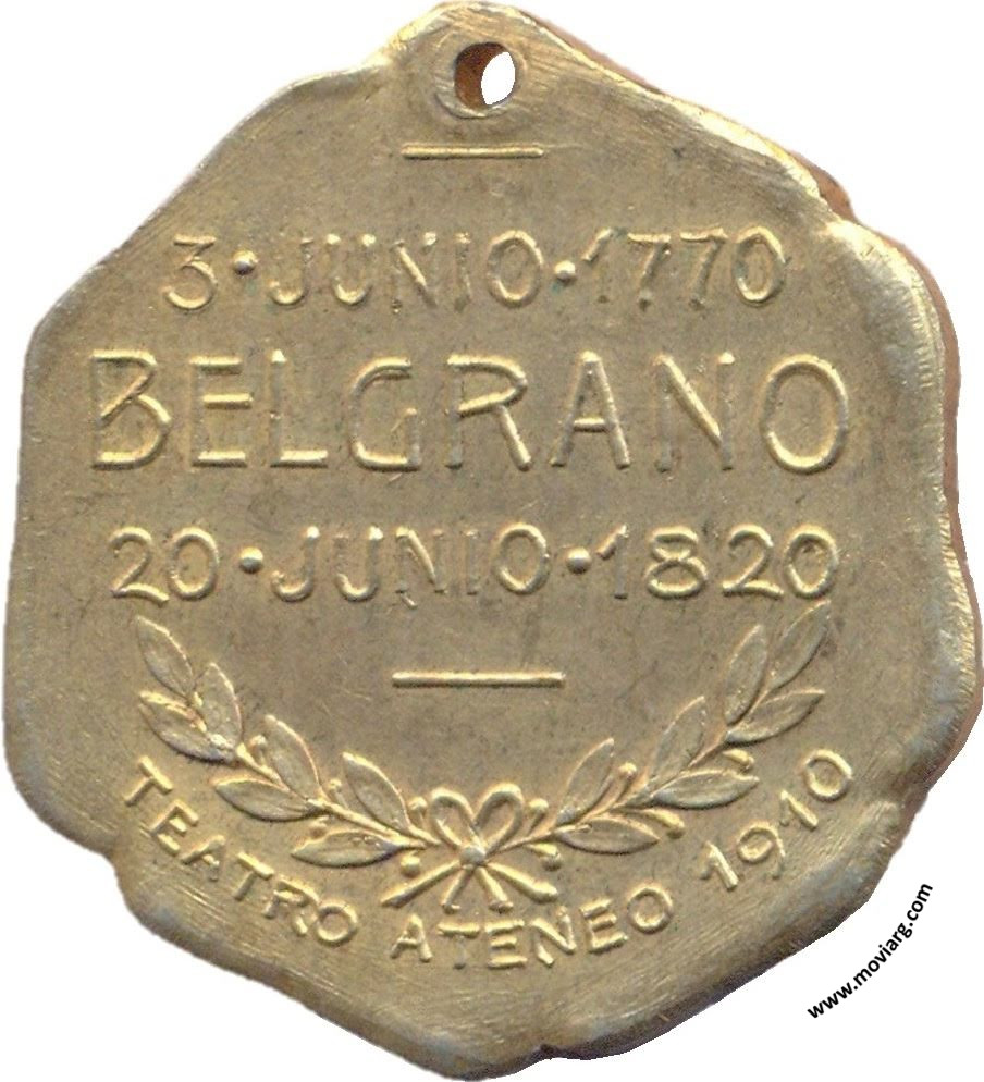 Anverso: Reverso: 3 JUNIO 1770 / BELGRANO / 20 JUNIO 1820 / TEATRO ATENEO - 1910 Referencia: | |