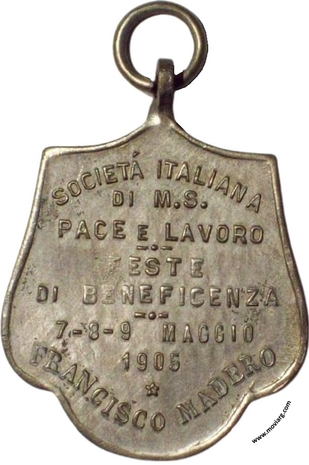 Anverso: Reverso: SOCIETÁ ITALIANA / DI M.S. / PACE E LAVORO / FESTE / DI BENEFICENZA / 7 - 8 - 9 MAGGIO / 1905 / FRANCISCO MADERO Referencia: | |