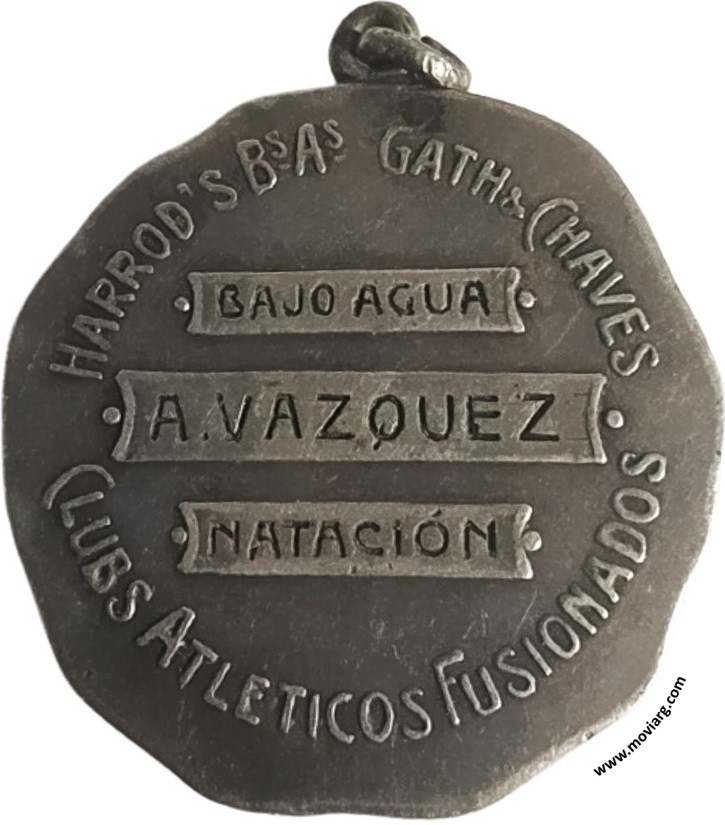 Anverso: Reverso: HARROD'S BS. AS. GATH & CHAVES / CLUBS ATLETICOS FUSIONADOS / [ BAJO AGUA ] / [ A. VAZQUEZ ] / [ NATACIÓN ] Referencia: | |