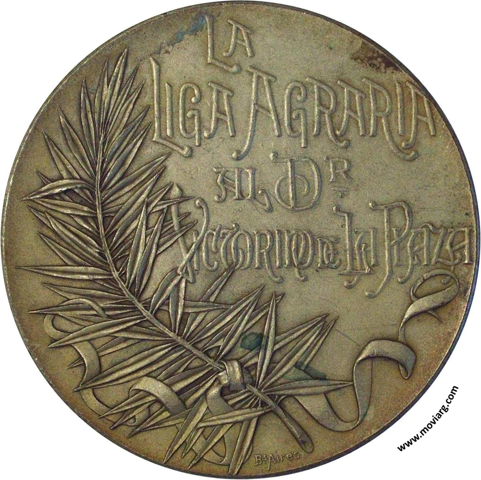 Anverso: CONFERENCIA FINANCIERA / AGOSTO 26 / DE 1899. Firma: BELLAGAMBA Y ROSSI Reverso: LA / LIGA AGRARIA / AL DR. / VICTORINO DE LA PLAZA. Exergo: BS. AIRES Referencia: BURZIO-3328 | |