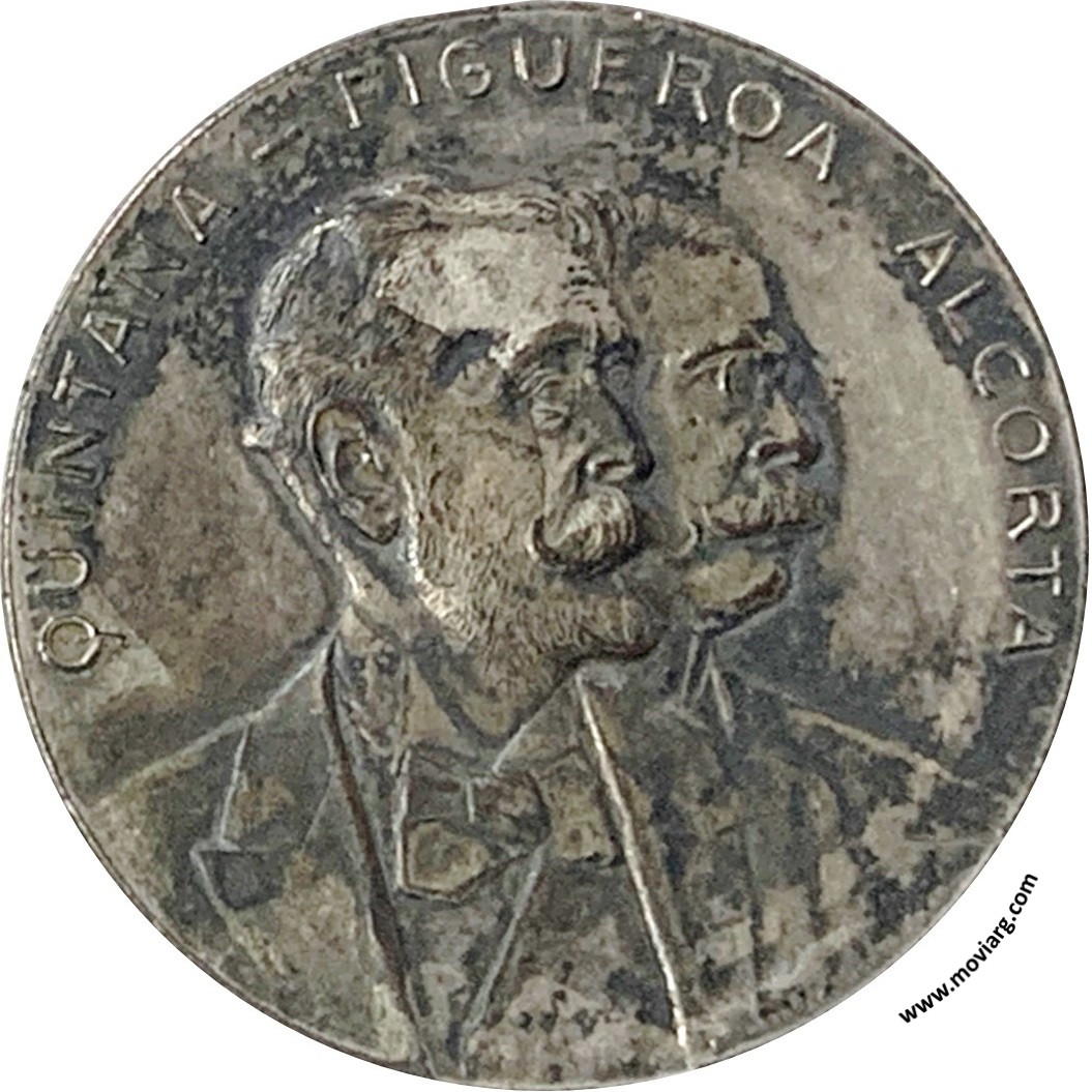 Anverso: QUINTANA - FIGUEROA ALCORTA. Firma: DE-PARI ESC. HORTA GRAB. Reverso: PRESIDENTE Y VICE DE LA REPUBLICA / 12 OCTUBRE / 1904 - 1910 Canto: Humberto Burzio: "Buenos Aires en la medalla" 1981 p42. Referencia: BURZIO-107 | |