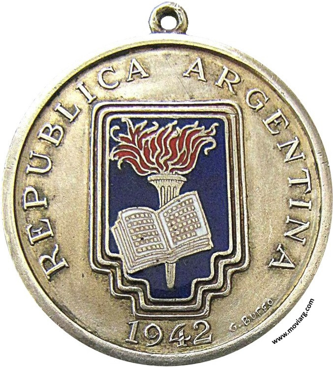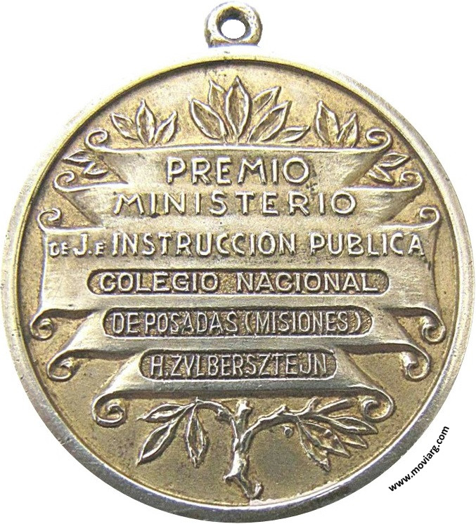 Anverso: REPUBLICA ARGENTINA / 1942. Firma: G. BUFFO Reverso: PREMIO / MINISTERIO / DE J. E INSTRUCCION PUBLICA / [ COLEGIO NACIONAL ] / [ DE POSADAS ( MISIONES ) ] / [ A. ZVLBERSZTEJN ] Canto: Liso. 900 Referencia: | |