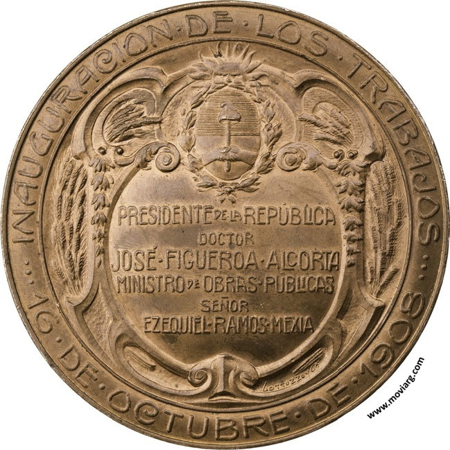 Anverso: FERRO · CARRIL · ARGENTINO · DEL · NORTE / PROLONGACION - DEAN · FUNES Á SANTA FÉ Reverso: INAUGURACION · DE · LOS · TRABAJOS / 16 · DE · OCTUBRE · DE · 1908 / PRESIDENTE DE LA REPÚBLICA / DOCTOR / JOSÉ · FIGUEROA · ALCORTA / MINISTRO DE OBRAS · PÚBLICAS / SEÑOR / EZEQUIEL · RAMOS · MEXIA. Firma: GOTTUZZO Y CA. Referencia: | |