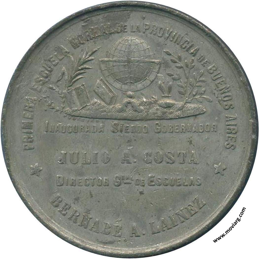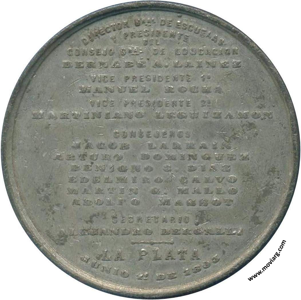 Anverso: PRIMERA ESCUELA NORMAL DE LA PROVINCIA DE BUENOS AIRES / INAUGURADA SIENDO GOBERNADOR / JULIO A. COSTA / DIRECTOR GRAL. DE ESCUELAS / BERNABÉ A. LAINEZ. Firma: PODESTA 8· H Reverso: DIRECTOR GRAL. DE ESCUELAS / Y PRESIDENTE / DEL / CONSEJO GRAL. DE EDUCACION / BERNABÉ A. LAINEZ / VICE PRESIDENTE 1° / MANUEL ROCHA / VICE PRESIDENTE 2° / MARTINIANO LEGUIZAMON / CONSEJEROS / JACOB LARRAIN / ARTURO DOMINGUEZ / BENIGNO G. DIAZ / EDELMIRO CALVO / MARTIN G. MALLO / ADOLFO MASSOT / SECRETARIO / ALEJANDRO BERGELLI / LA PLATA / JUNIO 1° DE 1893 Referencia: ROSA-/136 | |