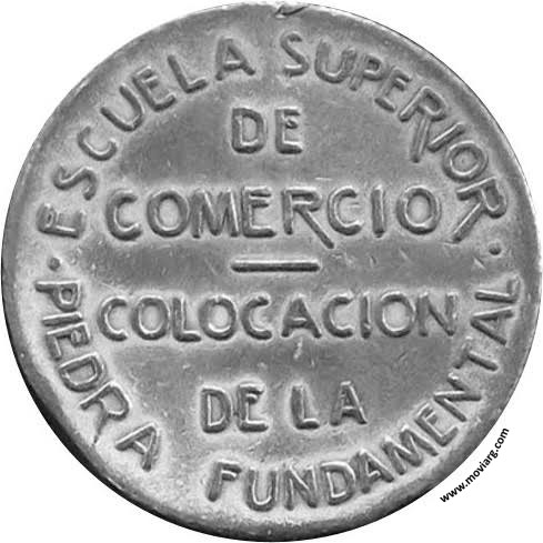 Anverso: ROSARIO / OCTUBRE 27 / 1907 Reverso: ESCUELA SUPERIOR / DE / COMERCIO / COLOCACION / DE LA / PIEDRA FUNDAMENTAL Referencia: | |