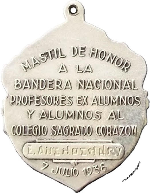 Anverso: Reverso: MASTIL DE HONOR / A LA / BANDERA NACIONAL / PROFESORES EX ALUMNOS / Y ALUMNOS AL / COLEGIO SAGRADO CORAZON / [ E. ANIHOI(???) ] / 7 JULIO 1938 Referencia: | |