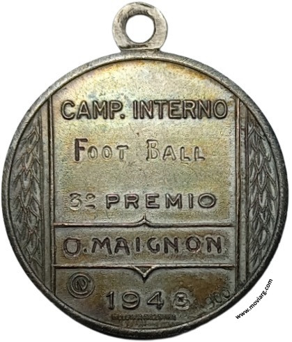 Anverso: CLUB ATLETICO "BANCO DE ITALIA". Campo: CABI Reverso: CAMP. INTERNO / [ FOOT BALL ] / [ 3° ] PREMIO / [ O. MAIGNON ] / 194 [ 8 ]. Exergo: [ 900 ]. Firma: CN / INDUSTRIA ARGENTINA Referencia: | |