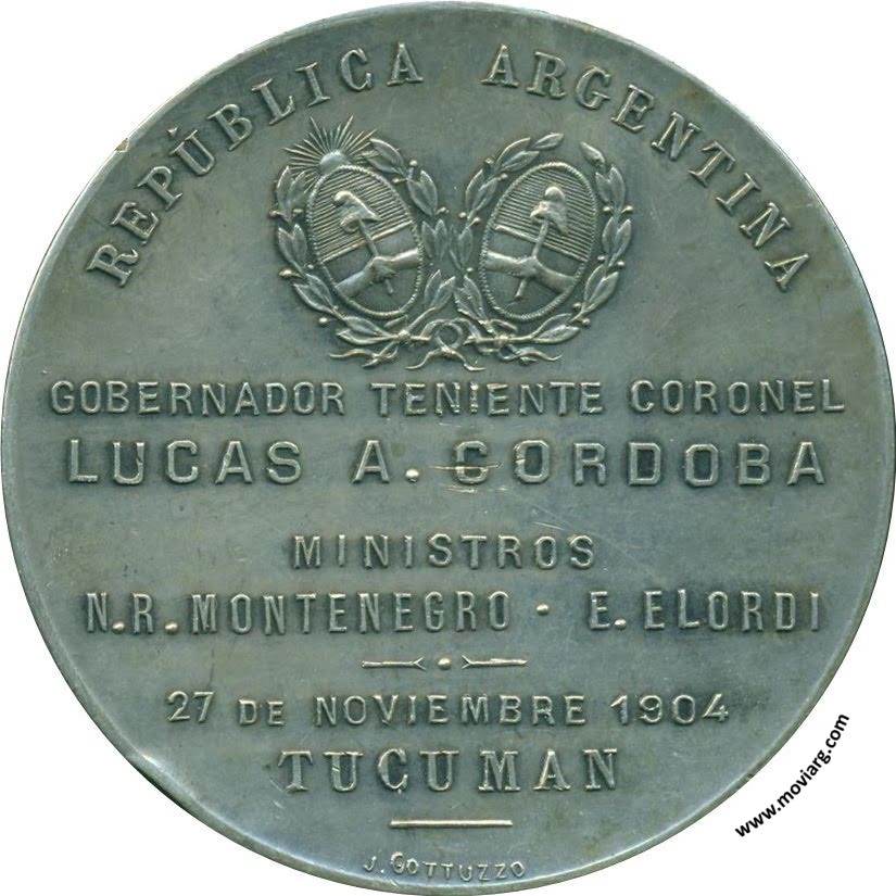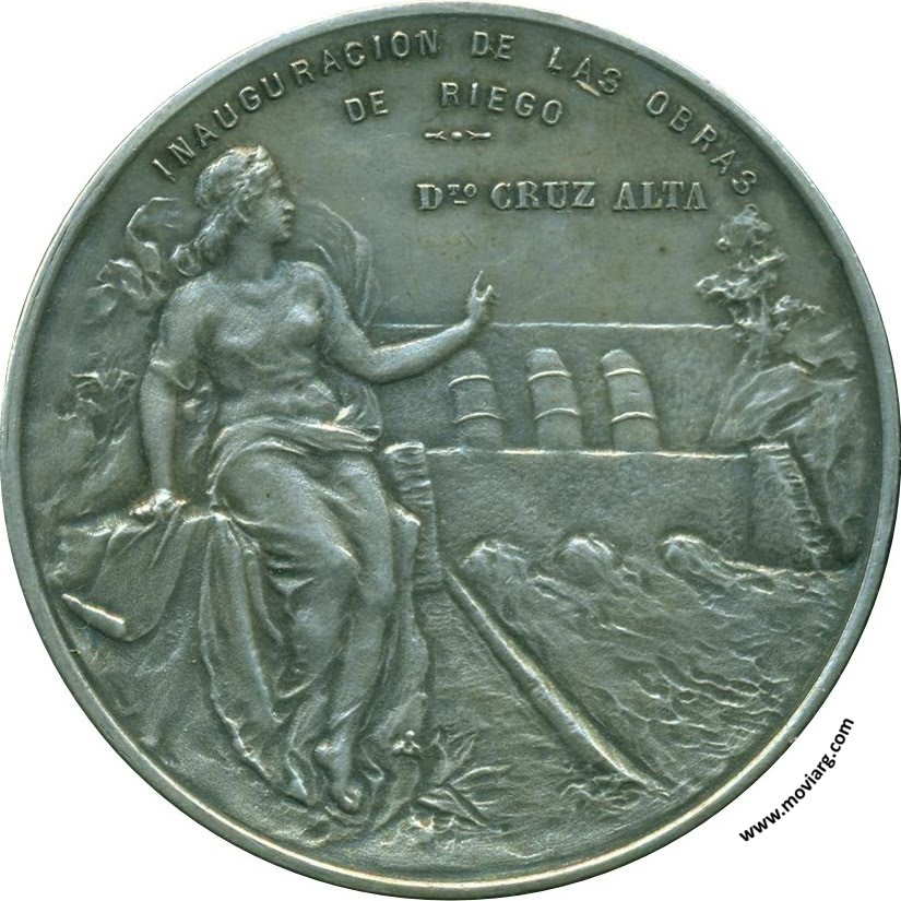 Anverso: INAUGURACION DE LAS OBRAS / DE RIEGO / DTO. / CRUZ ALTA Reverso: REPÚBLICA ARGENTINA / GOBERNADOR TENIENTE CORONEL / LUCAS A. CORDOBA / MINISTROS / N.R. MONTENEGRO · E. ELORDI / 27 DE NOVIEMBRE 1904 / TUCUMAN. Firma: J. GOTTUZZO Canto: Liso. PLATA Referencia: | |