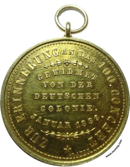 Anverso: DEUTSCHE SINGAKADEMIE / BUENOS AIRES Reverso: ZUR ERINNERUNG AN DAS 100. CONCERT / GEWIDMET / VON DER / DEUTSCHEN / COLONIE. / JANUAR 1889. Firma: GRANDE Canto: Liso Referencia: ROSA-597 FERRARI-155 (RG) | |