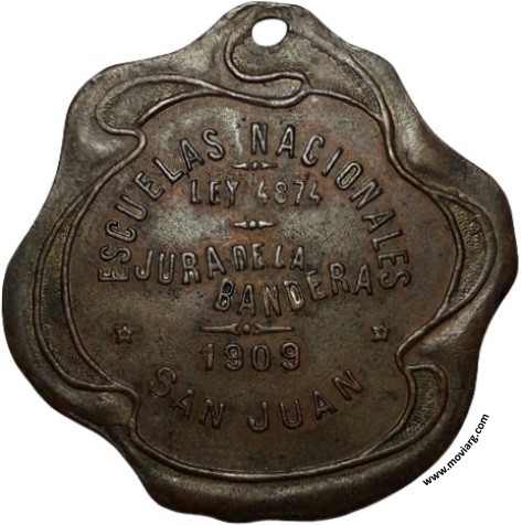 Anverso: Reverso: ESCUELAS NACIONALES / LEY 4874 / JURA DE LA / BANDERA / 1909 / SAN JUAN Referencia: | |