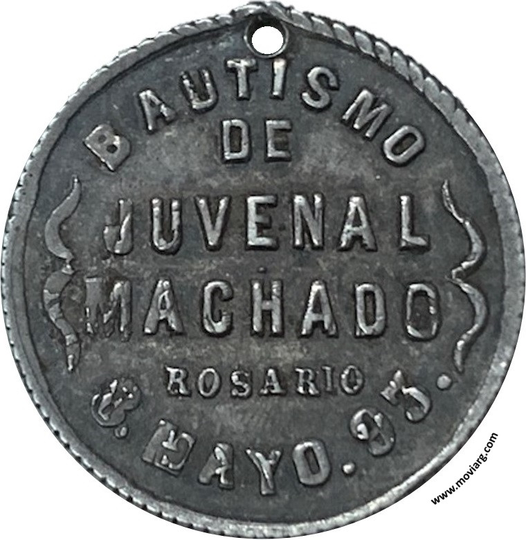 Anverso: BAUTISMO / DE / JUVENAL / MACHADO / ROSARIO / 8. MAYO. 93. Reverso: Descripción: Se ha utilizado como cospel una moneda de Plata de 10 centavos período 1881-1883. Referencia: | |