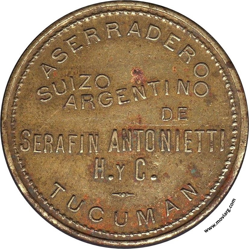 Colección Carlos Bravo Anverso: ASERRADERO / SUIZO / ARGENTINO / DE / SERAFIN ANTONIETTI / H. Y C. / TUCUMANReverso: 100 Referencia: | |