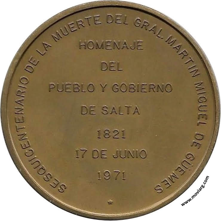 Anverso: Reverso: SESQUICENTENARIO DE LA MUERTE DEL GRAL. MARTIN MIGUEL DE GÜEMES / HOMENAJE / DEL / PUEBLO Y GOBIERNO / DE SALTA / 1821 / 17 DE JUNIO / 1971 Referencia: | |