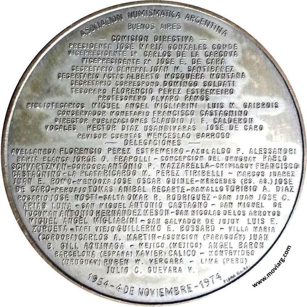 Anverso: Reverso: ASOCIACION NUMISMATICA ARGENTINA / BUENOS AIRES / COMISION DIRECTIVA / PRESIDENTE JOSE MARIA GONZALES CONDE / VICEPRESIDENTE 1° CARLOS DE LA CARCOVA / VICEPRESIDENTE 2° JOSE E. DE CARA / SECRETARIO GENERAL JUAN M. SANTIBAÑEZ / SECRETARIO ACTAS ALBERTO MOSQUERA MONTAÑA / SECRETATIO CORRESPOND. DOMINGO SOLDATI / TESORERO FLORENCIO PEREZ ESTEEMEIRO / PROTESORERO ALVARO RAMOS / BIBLIOTECARIOS MIGUEL ANGEL MIGLIARINI LUIS M. GAIBROIS / CONSERVADOR MONETARIO FRANCISCO CASTAGNINO / DIRECTOR PUBLICACIONES CLAUDIO J. F. CALDERON / VOCALES HECTOR DIAZ USANDIVARAS JOSE DE CARO / REVISOR DE CUENTAS WENCESLAO BARROSO / DELEGACIONES / AVELLANEDA FLORECIO PEREZ ESTREMEIRO - AZUL ALDO P. ALESSANDRI / BAHIA BLANCA JORGE O. FRAPOLLI - CONCEPCION DEL URUGUAY PABLO / CASTAGNINO - LA PLATA RICARDO M. PEREZ TIRIBELLI - MARCOS JUAREZ / JUAN E. ROMO - MENDOZA JOSE OSCAR GUINLE - MERCEDES ( BS.AS. ) JOSE / DE CARO - PEHUAJO TOMAS ANIBAL RECARTE - REMALLO TORIBIO A. DIAZ / ROSARIO JOSE NOSTI - SALTA OMAR R. RODRIGUEZ - SAN JUAN JOSE C. / ARIAS LUNAS - SAN MIGUEL ANTONIO CASTAGNO - SAN MIGUEL DE TUCUMAN ANTONIO HERNANDEZ MESON / SAN NICOLAS DE LOS ARROYOS / MIGUEL ANGEL MAGLIARINI - SAN SALVADOR DE JUJUY LUIS E. / ZURUETA - TAFI VIEJO GUILLERMO E. BOSSARD - VILLA MARIA / B. GILL AGUINAGA - MEJICO ( MEJICO ) ANGEL BARON / BARCELONA ( ESPAÑA ) XAVIER CALICO - MONTEVIDEO / ( URUGUAY ) RUBEN W. VERGARA - LIMA ( PERU ) / JULIO C. GUEVARA V. / 1954 - 4 DE NOVIEMBRE - 1974. Firma: PIANA BS. AS. Referencia: | |