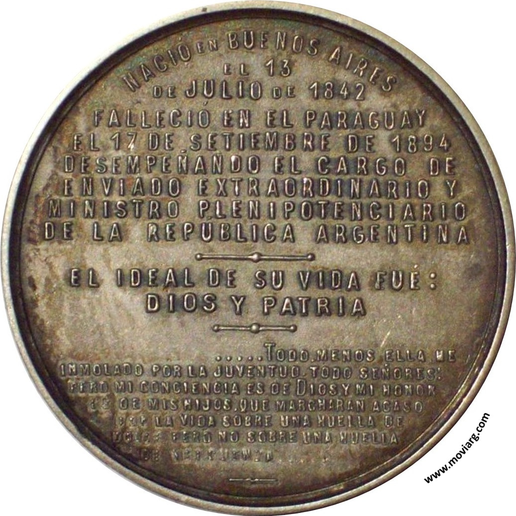 Anverso: JOSÉ ML. / ESTRADA Reverso: NACIÓ EN BUENOS AIRES / EL 13 / DE JULIO DE 1842 / FALLECIÓ EN EL PARAGUAY / EL 17 DE SETIEMBRE DE 1894 / DESEMPEÑANDO EL CARGO DE / ENVIADO EXTRAORDINARIO Y / MINISTRO PLENIPOTENCIARIO / DE LA REPÚBLICA ARGENTINA / EL IDEAL DE SU VIDA FUÉ: / DIOS Y PATRIA / ..... TODO MENOS ELLA HE / INMOLADO POR LA JUVENTUD. TODO SEÑORES: / PERO MI CONCIENCIA ES DE DIOS Y MI HONOR / ES DE MIS HIJOS. QUE MARCHARAN ACASO / POR LA VIDA SOBRE UNA HUELLA DE / DOLOR, PERO NO SOBRE UNA HUELLA / DE VERGÜENZA..... Referencia: | |