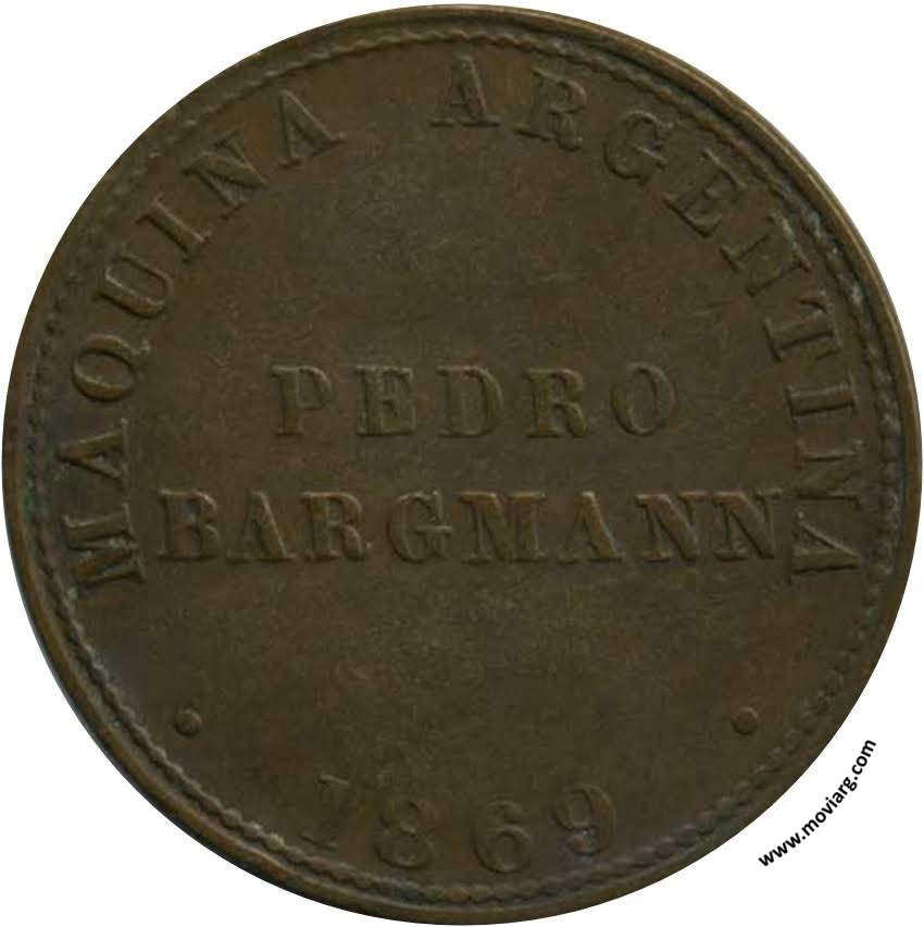 Anverso: MAQUINA ARGENTINA / PEDRO / BARGMANN / 1869 Reverso: SEÑA POR / DOS PANES Referencia: FONR-10099 | |