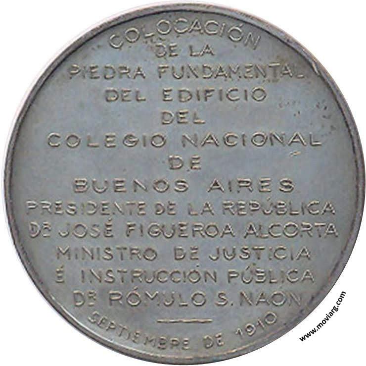 Anverso: PRAESIDUM ET DECUS URBIS / MINERVA. Firma: J.M. LUBARY Reverso: COLOCACIÓN / DE LA / PIEDRA FUNDAMENTAL / DEL / COLEGIO NACIONAL / DE / BUENOS AIRES / PRESIDENTE DE LA REPÚBLICA / DR. JOSÉ FIGUEROA ALCORTA / MINISTRO DE JUSTICIA / É INSTRUCCIÓN PÚBLICA / DR. RÓMULO S. NAÓN / SEPTIEMBRE DE 1910 Referencia: | |