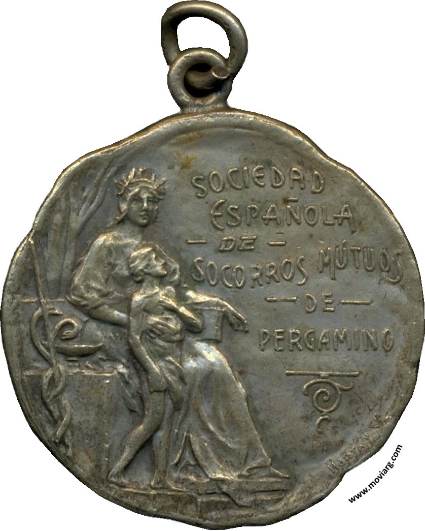 Anverso: SOCIEDAD / ESPAÑOLA / DE / SOCORROS MÚTUOS / DE / PERGAMINO. Firma: HORTA Y CIA. Reverso: 1858 - 4 FEBRERO - 1908 / BODAS / DE / ORO. Campo: [ 993 ] Referencia: | |