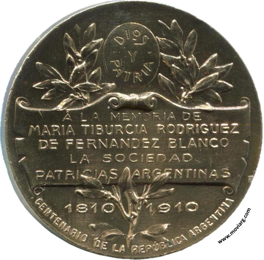 Anverso: 1778 / 1845 Reverso: DIOS / Y / PATRIA / Á LA MEMORIA DE / MARIA TIBURCIA RODRIGUEZ / DE FERNANDEZ BLANCO / LA SOCIEDAD / PATRICIAS ARGENTINAS / 1810 1910 / CENTENARIO DE LA REPÚBLICA ARGENTINA Referencia: | |