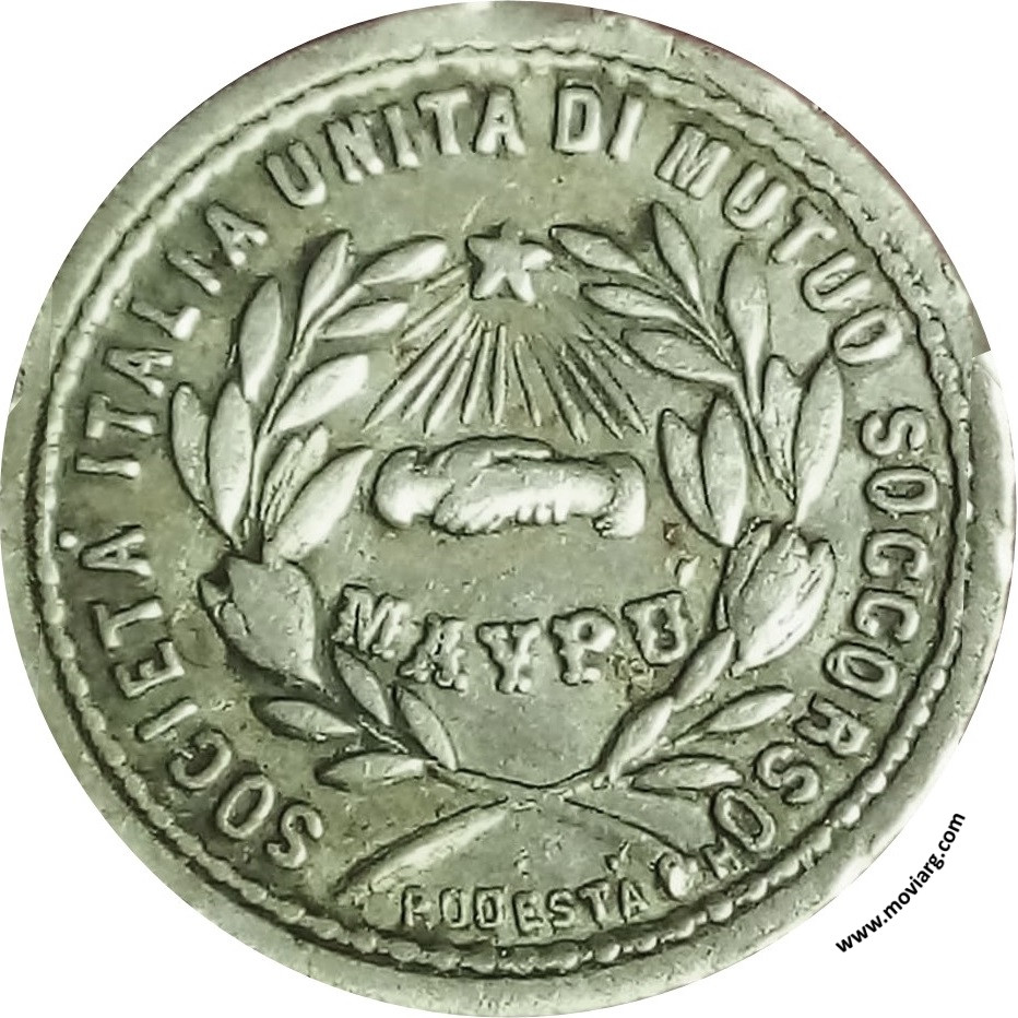 Anverso: SOCIETÁ ITALIA UNITA DI MUTUO SOCCORSO / MAYPÚ. Firma: PODESTA & H. Reverso: COLLOCAZIONE DELLA PIETRA FONDAMENTALE / 21 / MARZO / 1886 Referencia: | |